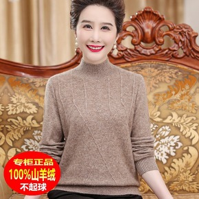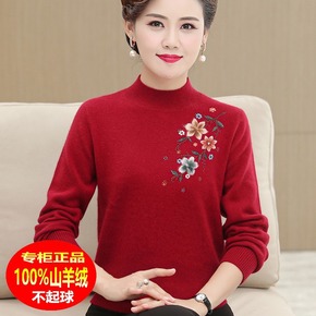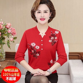 100纯羊绒绣花针织衫洋气妈妈装宽松上衣中老年大码...