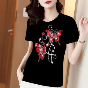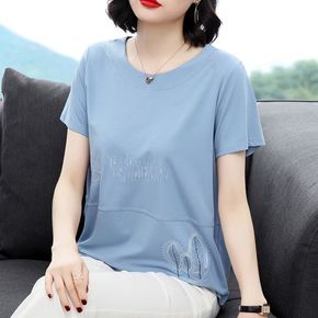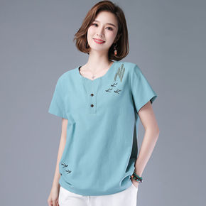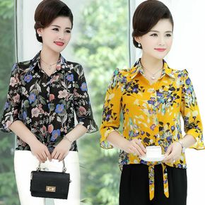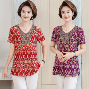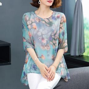 高档短袖雪纺衫女2021夏新款减龄印花妈妈装小衫宽...