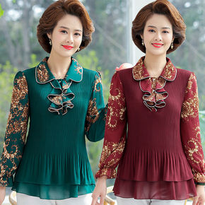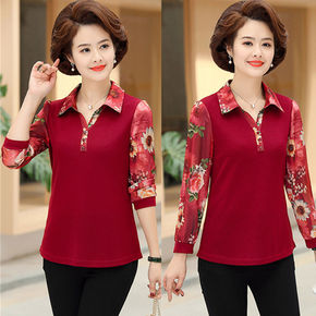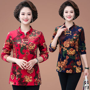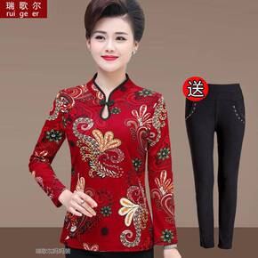 妈妈秋装大码复古长袖旗袍T恤50中老年女装洋气碎花...