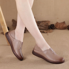 春秋新款真皮女单鞋平底软底中老年牛筋底大码浅口妈妈...