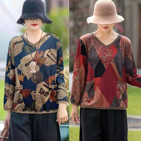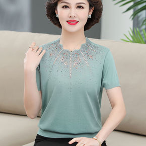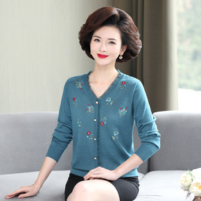 妈妈春装2021新款V领针织衫洋气中老年人绣花T恤...