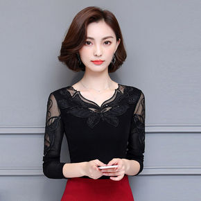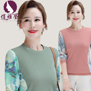女式T恤上衣2021秋季微弹舒适中老年女装网纱长袖...