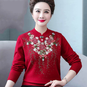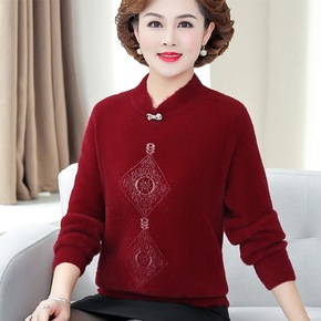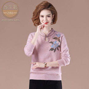 秋季新款立领旗袍中老年女装针织衫长袖宽松浮线提花减...