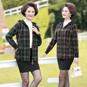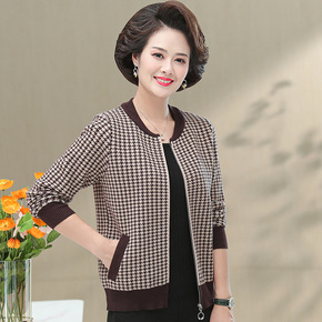 妈妈秋冬款格子开衫短款毛呢外套女中老年气质针织衫拉...