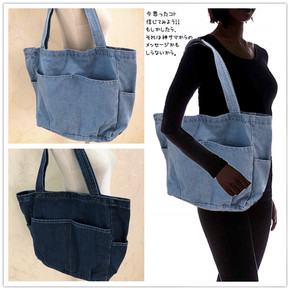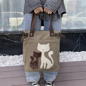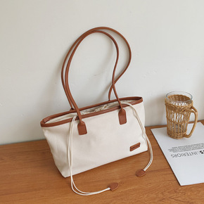 日系束口单肩包通勤托特包大容量帆布包妈妈购物袋长柄...