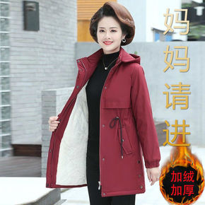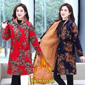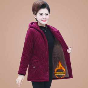妈妈冬装棉衣加绒加厚灯芯绒中长款连帽保暖外套中老年...