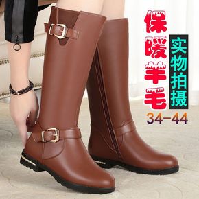 低跟过膝靴牛皮靴子女大码长筒棉靴冬季保暖舒适妈妈长...