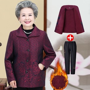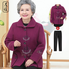 红老年人春秋装女奶奶装毛呢外套老年妈妈套装老太太洋...