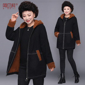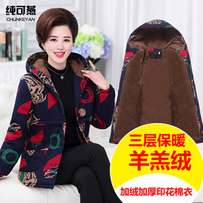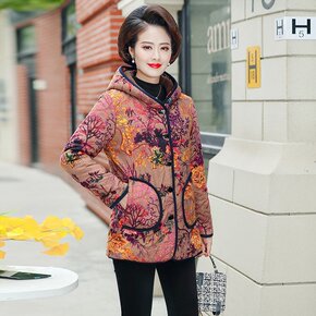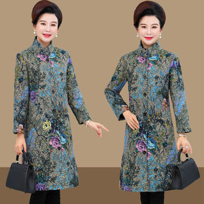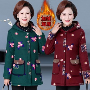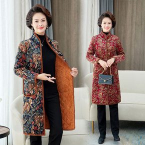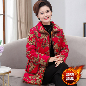 中年妈妈冬装长袖印花棉衣加绒加厚中长款外套中老年女...