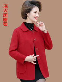 中老年女红色双面呢子羊绒大衣本命年妈妈装宽松短外套...
