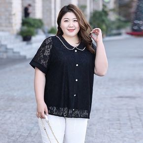 大码胖妈妈夏装蕾丝短袖上衣气质减龄胖mm女装遮肉显...