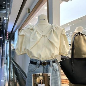 十三行女装2022春季新款韩版甜美泡泡袖单排扣V领...