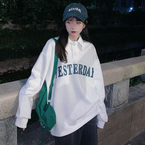 春秋新款薄款卫衣女字母POLO领学生宽松白色长袖上...