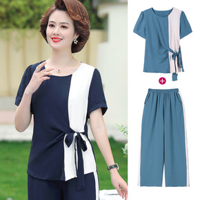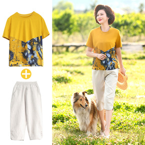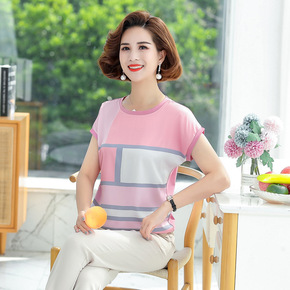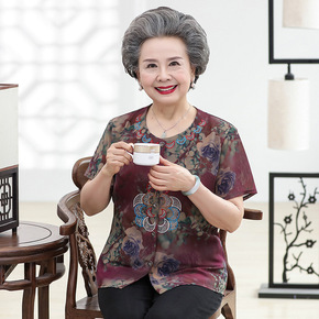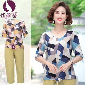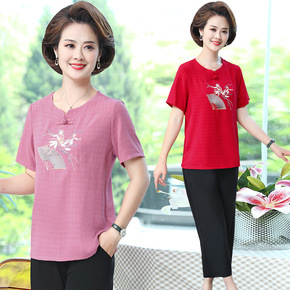 妈妈夏装洋气大码棉绸T恤中年女短袖上衣中老年休闲棉...