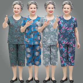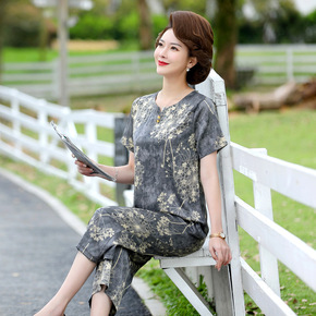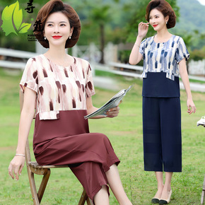 妈妈夏装V领短袖t恤衫套装40岁5岁中老年人女装清...
