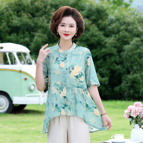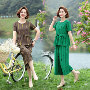 妈妈夏装套装棉麻小衫中老年女装短袖T恤洋气上衣阔腿...