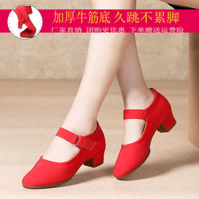 四季广场舞蹈鞋女中跟软底牛津布红色跳舞鞋防滑牛筋底...