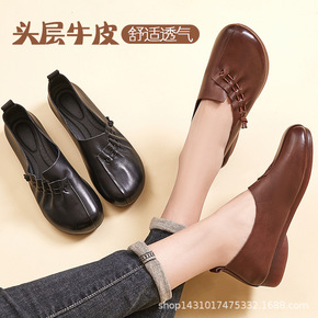 女鞋秋季新款单鞋真皮女士平底妈妈鞋休闲皮鞋软底软皮...