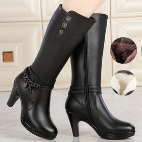 真皮高跟女靴细跟单靴羊毛中筒靴加绒皮靴中年妈妈女棉...