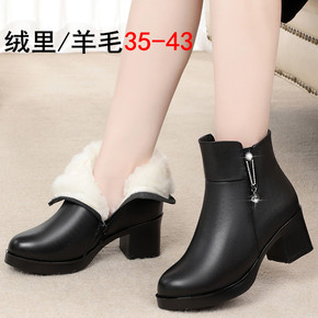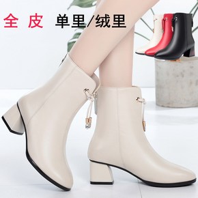 秋冬真皮女式皮靴高跟全牛皮短靴粗跟单靴加绒女棉靴中...