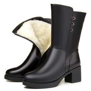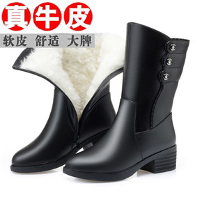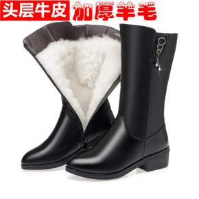 羊毛中筒靴女冬真皮女式皮靴高跟中年妈妈加绒靴子女粗...