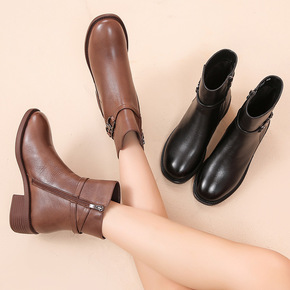 批发真皮粗跟短靴女秋冬款加绒保暖女靴中年大码中跟软...