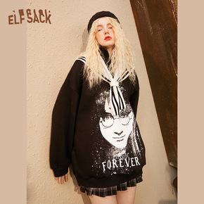 【新款】妖精的口袋海军领印花黑色加绒卫衣女2021...