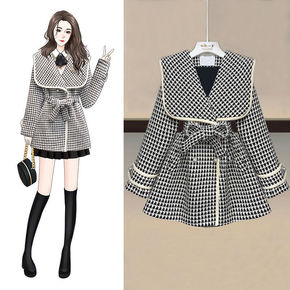 大衣女2021秋冬新款韩版设计感海军领显瘦千鸟格呢...