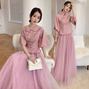 伴娘服中长款显瘦2021新款秋冬仙气质粉色中式短款...