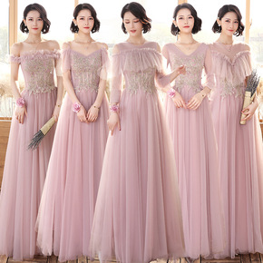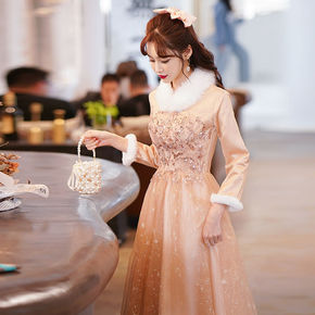 伴娘服冬季2021新款粉色加厚伴娘团姐妹礼服裙女仙...