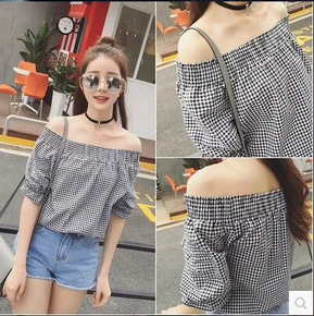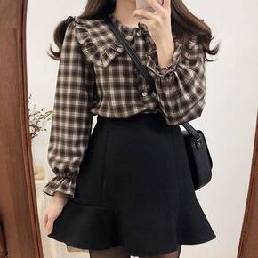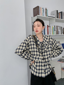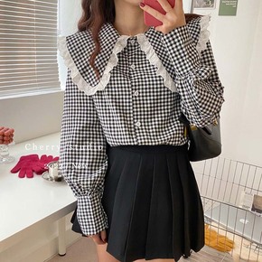 2022春季新款文艺宽松拼接格子衬衫娃娃领花边衬衣...