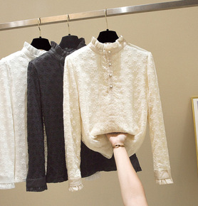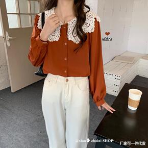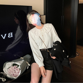 法式蕾丝花边娃娃领衬衫女长袖秋冬装设计感纯棉加绒保...