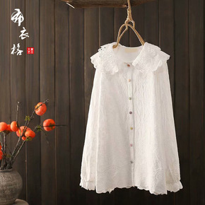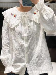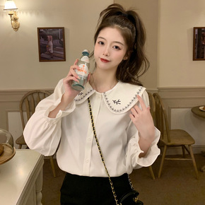 2002早春新款加厚衬衫小众设计感刺绣娃娃领喇叭袖...