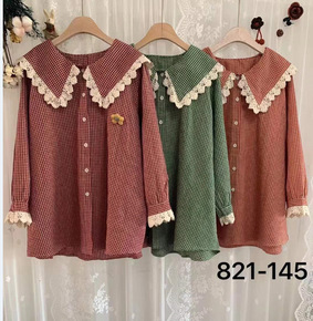 2021春季新款女装卡通小熊娃娃领甜美长袖格子衬衫...