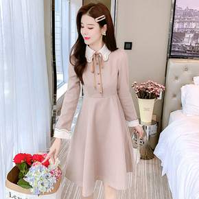 长袖娃娃领连衣裙女年春季新款法式桔梗收腰显瘦复古气...