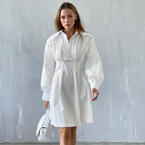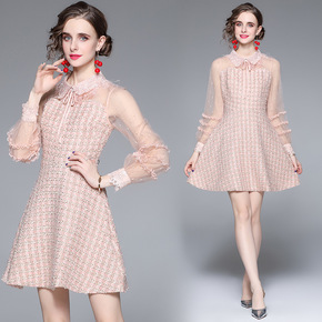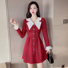 2022早春欧美短裙娃娃领蕾丝花边气质时尚收腰ch...