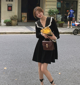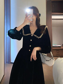 实拍2021秋装新款学院风娃娃领黑色丝绒连衣裙女赫...