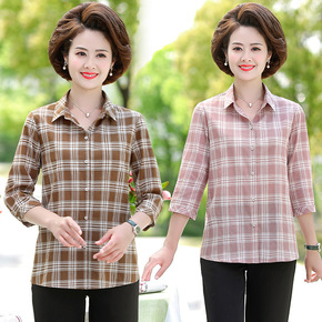 中老年七分袖薄防晒棉质衬衫女格子夏装妈妈装老年人夏...