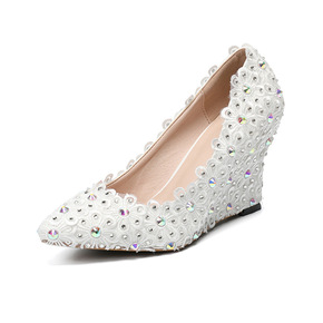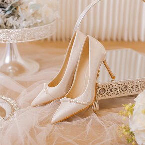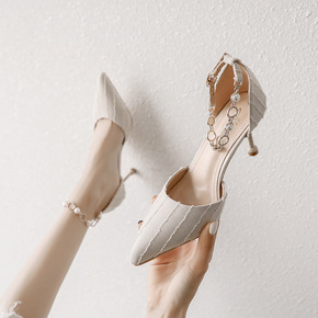新款珍珠法式两穿婚鞋细跟高跟鞋女新娘婚鞋尖头宴会鞋...