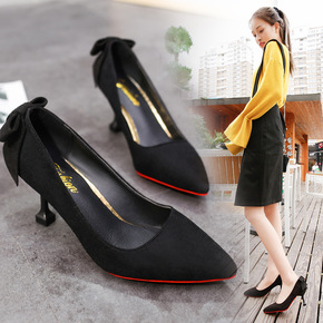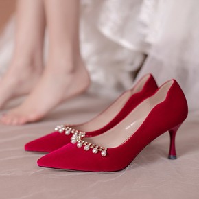 ZY绒面红色婚鞋女低帮鞋子女春秋细跟高跟鞋尖头女单...