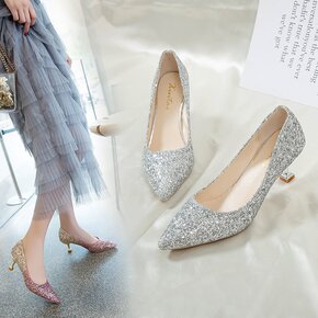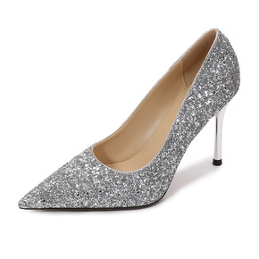 2020春季新款细跟单鞋女尖头浅口亮片高跟鞋时尚宴...