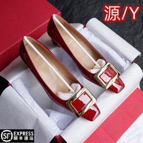 RV方扣单鞋女2022方头浅口高跟鞋通勤粗跟直跟漆...