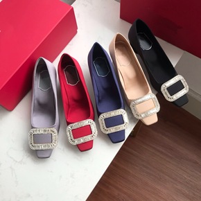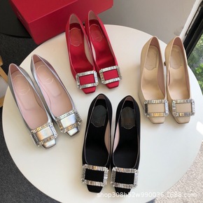 RV女鞋!水钻方扣高跟鞋方头中跟单鞋同款绸缎面粗跟...