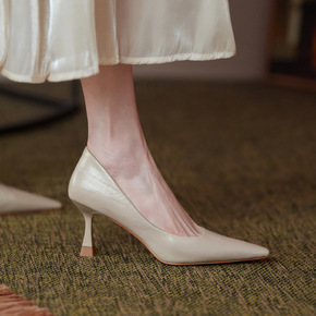 韩版气质高跟鞋女四季通勤牛皮细跟社交女鞋尖头浅口宴...