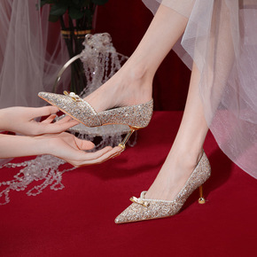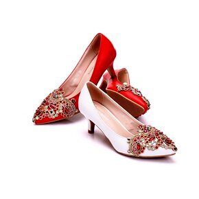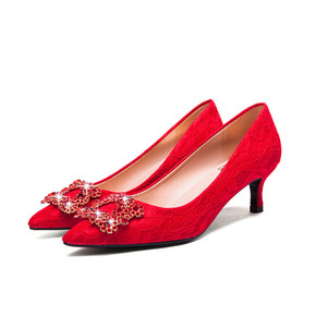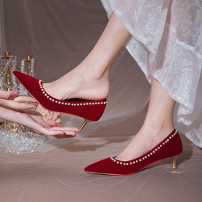 2019珍珠配饰2厘米219-25高跟红色婚鞋新娘...
