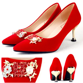 亮水晶绒面高跟女婚鞋细跟红色新娘鞋水钻双喜字敬酒鞋...