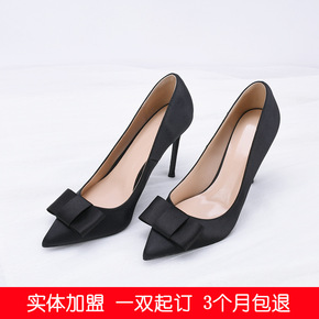 蝴蝶结黑色绸缎尖头浅口细跟高跟鞋婚鞋宴会伴娘鞋 优...