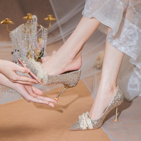 银色水晶主婚纱婚鞋女2021新款白色礼服蝴蝶结伴娘...