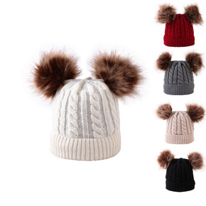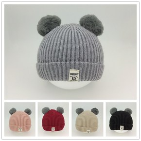欧美新款儿童针织帽 纯色双毛球保暖条痕男女宝宝套头...