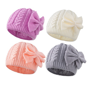 秋冬跨境新款儿童宝宝毛线帽 纯色圆顶蝴蝶结腈纶保暖...